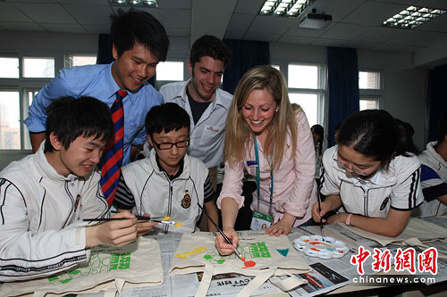 6月3日,上海世博会美国馆的学生大使利用工作之余,与上海中学生们交流环保理念,并一起设计帆布袋,描绘各自的“绿色梦想”。中新社记者 潘索菲 摄