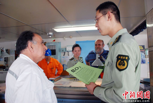 第39个世界环境日到来之际,山东烟台边防检查站官兵在烟台港开展了以“低碳减排,绿色生活”为主题的宣传活动。图为边检官兵向外籍船员讲解世界环境日的由来以及节能减排对世界环境的重要意义。