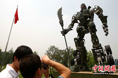 近日,一座高达9米手拿青龙偃月刀的“解放版关公”惊现京城。据悉,这是中央美术学院雕塑系学生毕横的毕业设计作品,它的原型是中国的第一辆汽车解放CA10。中新社发 富田 摄