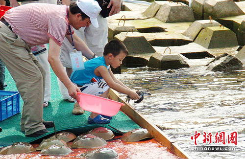 6月6日,2010年南海生物资源增殖放流暨休渔放生节在广东阳江海陵岛举行。图为一名儿童在家人的陪同下,将一只小海龟放回大海。中新社发 罗仰明 摄
