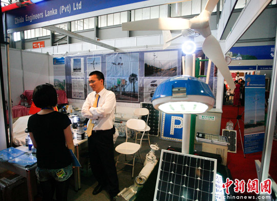 6月7日,正在昆明举行的第18届昆交会上,新能源产品成为各地客商的一大投资重点。据悉,此届昆交会首日签约的新能源项目总投资达200亿元,其中风电项目17个,太阳能项目1个。图为一家斯里兰卡企业展示一系列新能源产品。中新社发 刘冉阳 摄