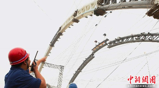 6月8日上午, 曹娥江袍江大桥全桥钢拱肋成功合龙。采用标志着这座浙江绍兴到上海的“桥头堡”难度最大分项工程顺利完成。曹娥江袍江大桥全长2207.6米,大桥按城市特大桥设计,设计车速为60km/h。预计2011年6月底建成通车。曹娥江袍江大桥位于国家级开发区浙江绍兴袍江经济技术开发区,这座大桥是连接建设中的嘉绍跨江大桥和上三高速交叉的沽渚枢纽必经通道。中新社发 袁云 摄