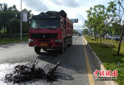 6月9日,海南省三亚市迎宾路发生一起特大道路交通事故。一辆重型自卸货车与一辆逆行驾载三人的二轮摩托车相撞,导致摩托车起火焚毁、货车部分损坏,摩托车上一男两女三人当场死亡。图为事故现场。中新社发 张运煦 摄