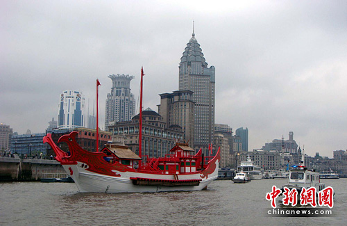以1:1比例复制的木制机帆船“遣唐使”6月10日在上海世博会周边控制水域试航,将参加定于12日举行的上海世博会日本馆日的庆祝活动。重建的“遣唐使”船体以日本飞鸟时代到平安时代(公元7世纪—9世纪)的“遣唐使船”为蓝本重建,以红白为主色调。外表皆为木质结构,船长33.6米,宽9.2米,船体上建有多座古式小屋,帆、桨、锚、舵等一应俱全,船体内核则为钢结构,船内装有发动机,同时设置了桅杆和船帆,可人工划桨。中新社发 周文涛 摄