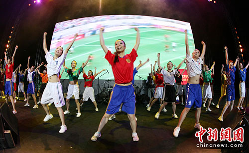 6月11日,世界杯足球赛在南非开幕,四川成都、眉山、乐山、绵阳等21市州的数多万男女球迷聚集在各地的体育馆、茶楼、酒吧等地一起吃观看比赛,球迷们还自编自演一起庆贺世界杯开战。中新社发 刘忠俊 摄