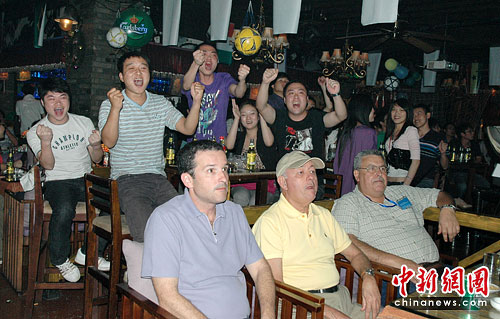6月11日晚,南非世界杯开幕式和揭幕战上演,点燃了桂林球迷狂热激情。图为几位巴西球迷和桂林球迷们在桂林某酒吧观看世界杯揭幕战。中新社发 唐梦宪 摄