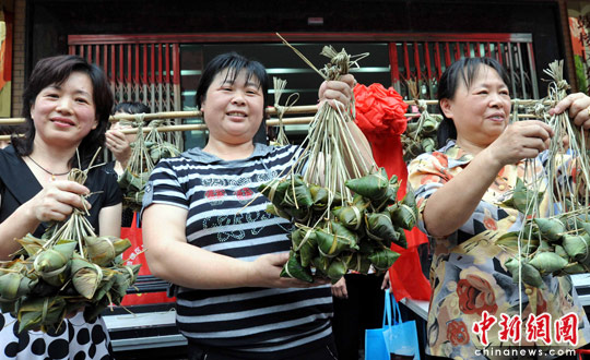 端午佳节将至, 6月12日,福建福州一社区中年女性居民(图中)在该社区举行的“粽叶飘香、品味端午”粽子大赛上以15分钟包得33颗粽子获得第一名,满怀喜悦。中新社发 刘可耕 摄