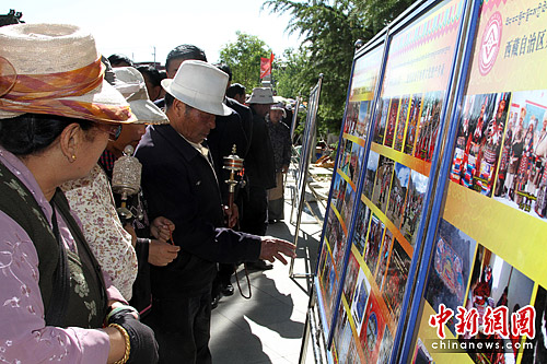 6月12日是中国“文化遗产日”。中国西藏自治区当日在拉萨市举行活动,向民众宣传文化遗产保护。图为拉萨民众一边转经一边观看展览。中新社发 徐长安 摄