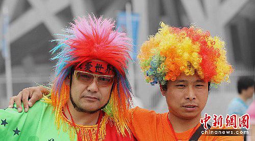 南非世界杯是全世界球迷的节日。自开幕以来,各地球迷纷纷聚在一起,穿戴上各式搞怪行头,享受这场足球盛宴。图为6月中旬,球迷在北京“鸟巢”前聚会。中新社发 苏丹 摄