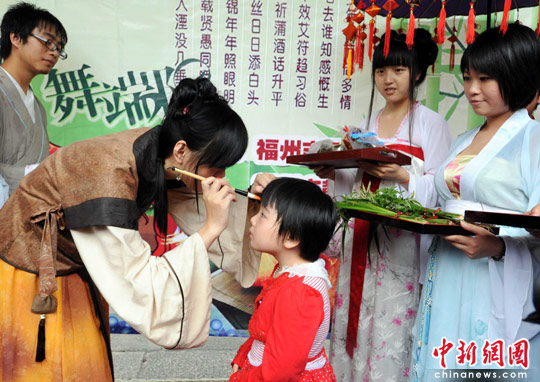 6月14日是大陆端午节假期首日,以“共享传统端午”为主题的端午文化节活动在福州举行。主办方通过举办兰汤浴、刺五毒、猜谜、点雄黄、书写“午时书”等传统端午活动,吸引不少民众冒雨前来体验传统文化大餐。图为参加该文化节活动的福建汉服爱好者按传统仪式为福州儿童点雄黄。中新社发 刘可耕 摄