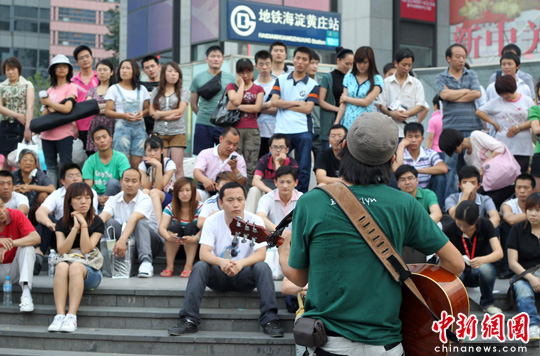 6月15日是端午小长假第二天,一流浪歌手在北京中关村街头开起了演唱会,吸引了到中关村逛街购物的市民驻足聆听。中新社发 苏丹 摄