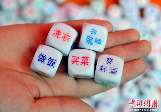 传统端午节假日,福州一创意集市上出售的新流行“家务骰子”等引起年轻人的浓厚兴趣。据该集市的一位经营业者介绍,所谓“家务骰子”,就是骰子六面分别写有“扫地”、“拖地”、“洗衣”、“洗碗”、“买菜”、“呆着”字样,然后靠掷骰子来决定谁做家务谁可以休息,这种骰子刚推出就尤其受到80后年轻夫妻的青睐。中新社发 刘可耕 摄