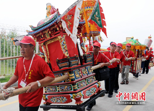 6月18日,金门真武殿关圣帝君进香团一行100多人乘坐厦金航线“小三通”马可波罗号轮船抵达福建厦门五通码头。参加第二届海峡论坛、第三届海峡两岸文博会系列活动的万名台胞将陆续抵达厦门。中新社发 刘可耕 摄