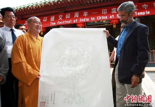 6月20日,中国嵩山少林寺方丈释永信向印度驻华大使苏杰生赠送千手千眼观音图。当日,“中国印度节在少林寺”活动拉开帷幕。2010年是中印两国建交60周年,该活动是两国文化交流项目之一。中新社发 王中举 摄