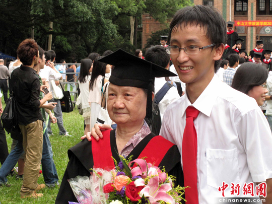 6月20日,一位老人家穿上孙子的学士服在广州一所大学校园里与参加毕业典礼的孙子合影,据有关部门统计,2010年广东高校大学毕业生达60万人。中新社发 罗仰明 摄
