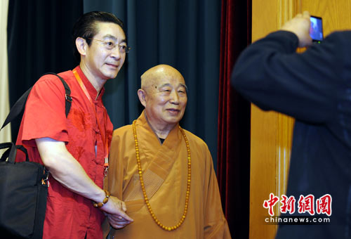 6月21日,中国道教协会第八次全国代表大会在北京开幕。图为列席本次大会的著名演员六小龄童与中国佛教协会会长传印合影留念。中新社发 刘震 摄
