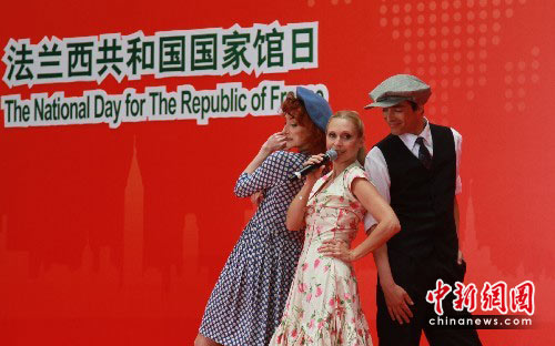 6月21日,上海世博会法国国家馆日庆典活动在园内举行,法国艺术家表演特色歌舞,尽显浪漫风情。中新社发 殷春永 摄