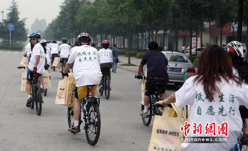 6月21日,四川省眉山市“夏至低碳日”活动正式启动,瑞士驻华大使馆发展参赞沃尔特·梅尔与市民骑自行车上街宣传低碳生活和环保。眉山市政府将每年农历“夏至”确定为低碳日,倡导市民骑自行车上下班,餐住行业取消一次性用品,超市不提供购物塑料袋等活动。2010年6月3日,中国的宁夏银川、四川眉山、山东德州和北京东城区成为中瑞合作低碳城市项目首批试点城市。中新社发 刘忠俊 摄