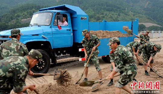 6月22日,福建武警官兵在福建南平市迎宾路奋力将山洪带来的淤泥清除。自6月13日以来,福建连续遭受特大暴雨袭击,造成了历史罕见的自然灾害,截至21日16时初步统计因灾死亡76人、失踪79人,直接经济总损失95.51亿元人民币。中新社发 刘可耕 摄