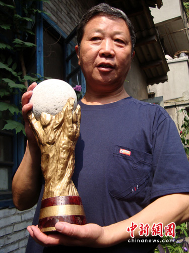 6月21日,四川乐山63岁的退休老人尹儒洪在自家院里展示山寨“大力神杯”,一块石头和一截树根,老球迷把对世界杯的狂热演绎到了极致。金光闪闪的“冠军奖杯”吸引了不少球迷前来“捧杯过瘾”。中新社发 刘忠俊 摄