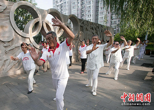 6月22日清早,北京东四奥林匹克社区千余名居民来到社区公园打太极拳、太极扇,迎接6月23日国际奥林匹克日的到来。中新社发 杜洋 摄
