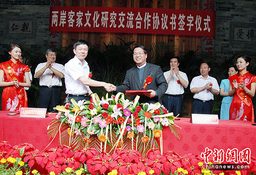 6月22日,福建省永定县“两岸客家文化研究院”与台湾大学客家研究中心缔结了交流合作关系。今后,双方将加强两岸客家文化交流与合作,共同整合两岸客家研究,弘扬客家文化,创新客家文明。并结合两岸产业、政府、学术界,共同推展客家文化创意产业。刘永良 摄