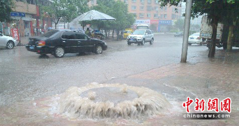 重庆遭遇大雨袭击 下水井成“喷泉”