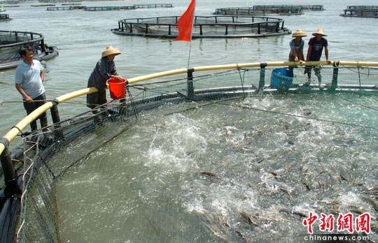 6月23日,广东省深水网箱产业园建设项目在广东湛江特呈岛正式启动。深水网箱与传统网箱相比,具有抗灾能力强、养殖效果优、经济效益显著等特点。一组深水网箱平均养殖产量约40吨,相当于75只传统网箱产量的总和,平均产值180万元,相当于160只传统网箱产值。广东在未来5年,将建设10-15个深水网箱养殖产业园区,发展深水网箱1000组,置换16至20万个传统网箱,腾出近岸海域约200平方公里。中新社发 罗仰明 摄