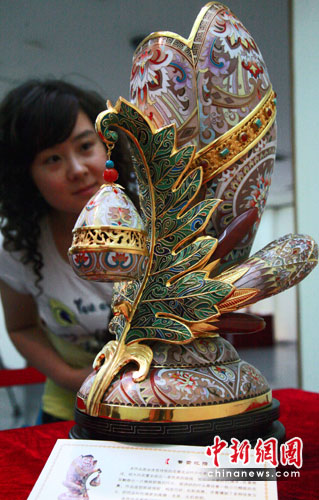 6月23日,由中国工艺美术协会举办的首届“当代中国工艺美术大师景泰蓝获奖珍品展”在河北美术馆拉开帷幕。据了解,这是新中国成立以来首次举办大规模、高级别的景泰蓝展。图为镶嵌多种珍贵玉石的《馨蕾花插》吸引美女的眼球。 中新社发 翟羽佳 摄