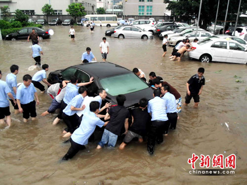 6月13日以来,持续强降水给福建带来严重灾情。图为6月22日下午,福州地区大雨滂沱,马尾区地势低洼处顿成泽国,区内104国道旁一停车场大面积积水,停车场内停放的200余辆新轿车遭水淹。中新社发 朱晓航 摄