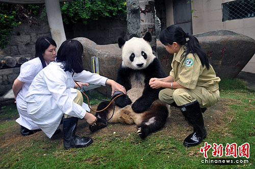 6月23日,“百岁”熊猫明星巴斯正在福州熊猫世界接受医务人员测量血压。23天前,“巴斯”突然病危,经各方努力终于再次续写了生命奇迹,现已度过危险期,这算得上是“巴斯”的第三次新生。今年11月,她将迎来30岁生日,相当于人类百岁,在熊猫中可以算得上是绝对的高寿。中新社发 张丽君 摄