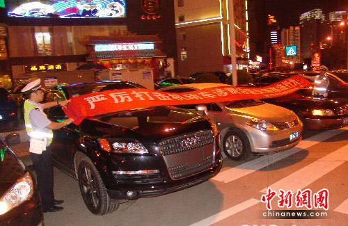 6月23日晚,广西南宁市公安局交警支队出动大批警力,严查机动车涉牌涉证违法行为,一批如奥迪Q7、大众途锐等豪车因涉嫌无证、套牌、使用假牌照而落网。中新社发 刘康 摄