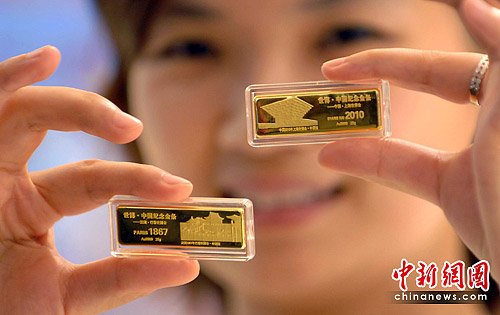 6月24日,首款以世博会历史上最早的中国馆为题材的“世博·中国纪念金条”在北京菜百公司首发。此次发行的两根25克款金条分别雕刻有1867年巴黎世博会的中国场馆和2010年上海世博会的东方之冠场馆。中新社发 邹宪 摄