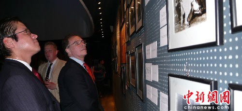 中国向秘鲁移民160周年回顾展24日晚在上海世博园秘鲁馆内举行,秘鲁驻中国大使哈罗德·福塞斯出席展览。福塞斯大使表示,华人在秘鲁民族构成中占有重要地位,可以说秘鲁民族含有部分中国血统。图为福塞斯大使(右一)在观看展览图片。中新社发 龙剑武 摄