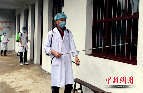 6月24日,福建建阳市将口镇卫生院医务人员在相关防疫专家指导下在设立于该镇芹口村的一灾民安置点区域进行防疫消毒,以确保“大灾之后无大疫”。 自6月13日以来,福建轮番遭受特大暴雨袭击,造成了历史罕见的自然灾害。仅闽北建阳市,初步统计,全市受灾人口14.6万人,3236间房屋倒塌、水稻、烟叶等农作物受灾面积17.4万亩,直接经济损失4.658亿元。中新社发 刘可耕 摄