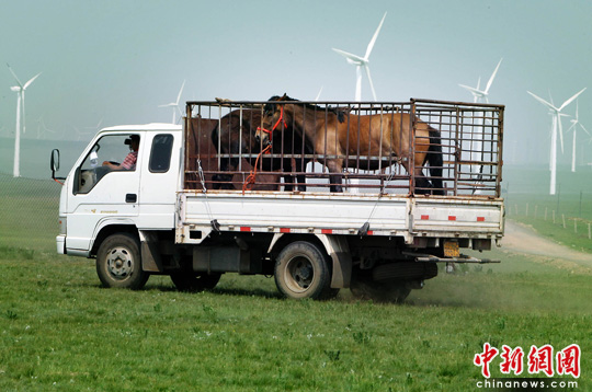 6月26日,内蒙古自治区乌兰察布市察右中期辉腾锡勒草原的一户蒙古族牧民,用自家新购置的卡车将马匹运送到新的牧场。据当地牧民介绍,如今大多数蒙古族牧民放牧、外出基本都驾驶汽车和摩托车,昔日驰骋草原的良驹如今少有无用武之地。中新社发 任晨鸣 摄
