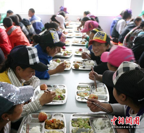 6月28日,经过48个小时的长途跋涉,青海省玉树藏族自治州民族中学首批500名异地复课师生,顺利抵达四川都江堰八一聚源中学,从此开始长达两年的异地复课生活。待第二、三批730名师生抵川后,玉树藏族自治州民族中学将在7月1日正式复课。8月下旬该校2010级初一、高一级400多名新生也将陆续抵达新学校。图为抵达四川玉树灾区学生在新学校吃饭。中新社发 刘忠俊 摄
