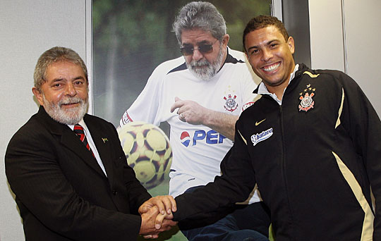巴西球星罗纳尔多(右)与巴西总统卢拉握手。