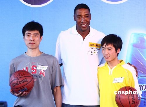 6月3日,NBA前公牛队传奇巨星、六次NBA总冠军获得者斯科特·皮蓬来到北京,为NBA中国与宝洁发起的“篮球星级体验赛进社区活动”启动助阵。活动现场,皮蓬更是按耐不住与中国篮球爱好者们一起切磋球艺。在接下来的两个月中,一系列富有挑战性、趣味性的篮球体验营与篮球挑战赛将陆续在北京,上海,广州和深圳等十大城市社区打响。中新社发 李学仕 摄