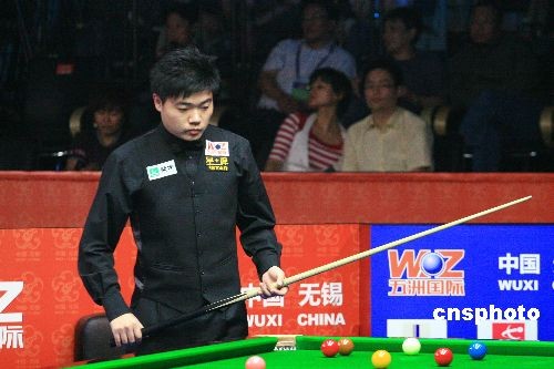 6月5日晚上,在江苏无锡举行的2009世界斯诺克江苏精英赛进入第二天小组循环赛最后一轮的争夺战中,丁俊晖以2比0战胜威尔士选手瑞恩·戴。这样,丁俊晖在6月4日首场与同胞李行的比赛失利后,随后连胜四场,成功晋级,将于6月6日进行半决赛。中新社发 丁焕新 摄