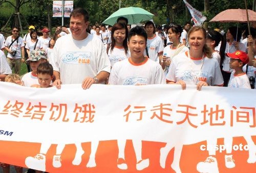 6月7日,由联合国世界粮食计划署(WFP)、中国扶贫基金会、WFP主要企业合作伙伴共同举办的2009“终结饥饿——行走天地间”全球慈善义走活动(中国站)在上海举行。奥运冠军李小鹏(中)应邀出席并亲身参与了慈善义走活动,呼吁人们共同抗击全球范围内的儿童饥饿和营养不良问题。中新社发 汤彦俊 摄