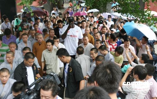 7月13日,河南登封,NBA著名中锋奥尼尔用手机记录“千年古刹”少林寺。当日,NBA著名中锋奥尼尔造访少林。中新社发 王中举 摄