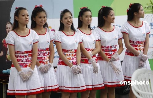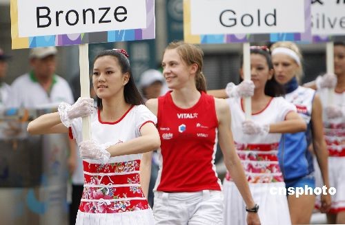 7月17日,第八届世运会礼仪小姐身着具有客家特色花纹颁奖礼服,为获奖运动员颁奖。中新社发 杜洋 摄
