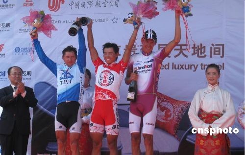 7月18日,第八届环青海湖国际公路自行车赛结束了第一赛段的争夺。青海天佑德队选手吴生君(左三)以四小时十六分四十八秒的成绩勇夺赛段冠军,并摘得爬坡冠军,这是青海本地选手首次夺得环湖赛赛段冠军。中新社发 丁鹤 摄