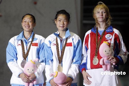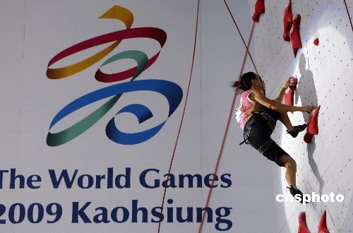 7月18日,在高雄举办的第八届世运会上,中国姐妹花何翠莲、何翠芳在女子攀岩竞速赛上分获金银牌,妹妹何翠莲更为中国队摘得首金。中新社发 杜洋 摄