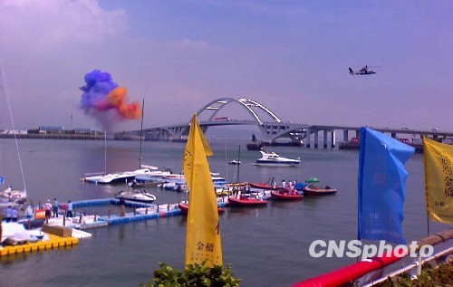 7月30日,两岸间首次大型帆船类比赛——首届海峡杯帆船赛在厦门启动。集结厦门五缘湾码头的两岸15艘帆船,在简短的启航仪式之后,扬帆出发,直航台南市安平港。中新社发 杨伏山 摄