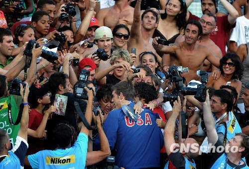 罗马时间8月1日晚,罗马游泳世锦赛男子100米蝶泳菲尔普斯最后时刻惊险超越,以破世界纪录的成绩摘得金牌。颁奖仪式后,菲尔普斯的母亲拥抱儿子为其祝福。中新社发 廖攀 摄
