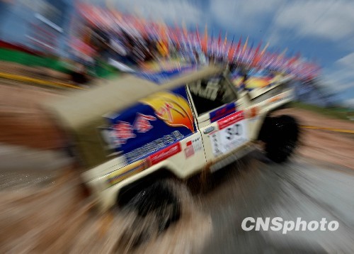 2009“巨力杯”鄂尔多斯全国汽车场地越野锦标赛分站赛,8月2日在风光秀美的内蒙古鄂尔多斯康巴什新区金港湾国际赛车城举行,来自香港的车手李柏寿代表河南黄金叶越野车队参加无限改装组比赛,精彩的比赛吸引着在场观众和媒体。中新社发 赵振清 摄