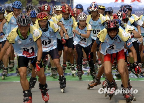 8月6日,来自中国各地20支队伍的100多名运动员,在风景秀丽的福建泰宁丹霞地貌景区参加全国山地户外运动挑战赛,展开越野跑、登山穿越、山地自行车、皮划艇、直排轮滑等7大项9小项的角逐。图为运动员上演轮滑秀。中新社发 王东明 摄