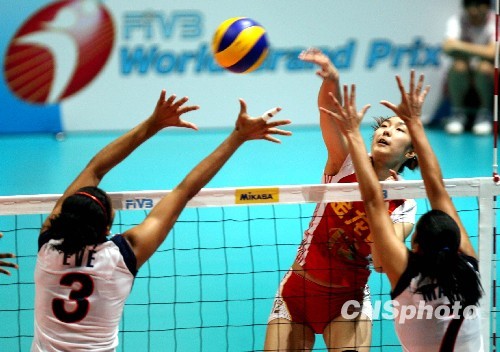 二00九年世界女排大奖赛香港站14日在香港体育馆揭幕。来自中国 、波兰 、荷兰 、多米尼加共和国四支劲旅进行为期三天的赛事。当晚,中国女排迎战多米尼加共和国以三比一首战告捷。图为十二号队员殷娜表现出色。中新社发 洪少葵 摄